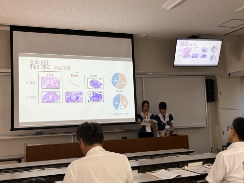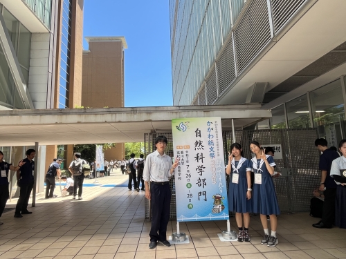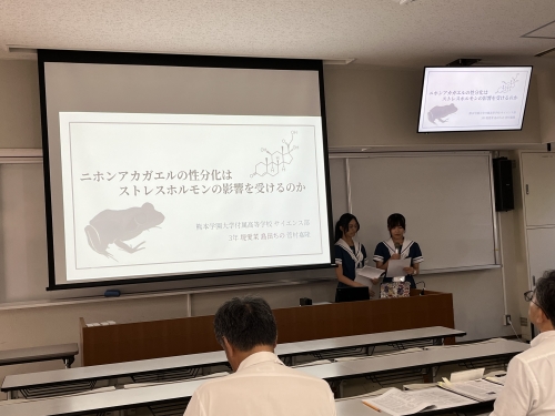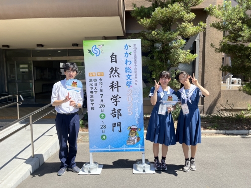 7月26日(土)~28日(月)に香川県高松市で開催された「かがわ聡文祭2025」自然科学部門において、本校3年生の堤さん、島田さん、菅村さんが生物部門で「ニホンアカガエルの性分化はストレスホルモンの影響を受けるのか」というタイトルで研究発表を行いました。中高一貫4期生の生徒たちが高校に進学するときに作られた当時のサイエンス同好会から、10期生の生徒たちによってついに全国聡文祭で発表できるところまで発展しました。残念ながら表彰を受けることはありませんでしたが、物理部門の熊本高校さん、地学部門の宇土高校さん、ポスター部門の濟々黌さんが文化庁長官賞や奨励賞を受賞している様子を見て、「自分たちも表彰式で並びたかった」と言っていた気持ちが、後輩たちへと引き継がれてますます発展することを期待します。また、巡検や交流会では全国の同じ志を持った高校生たちと関りを持てたことも、素晴らしい経験となりました。