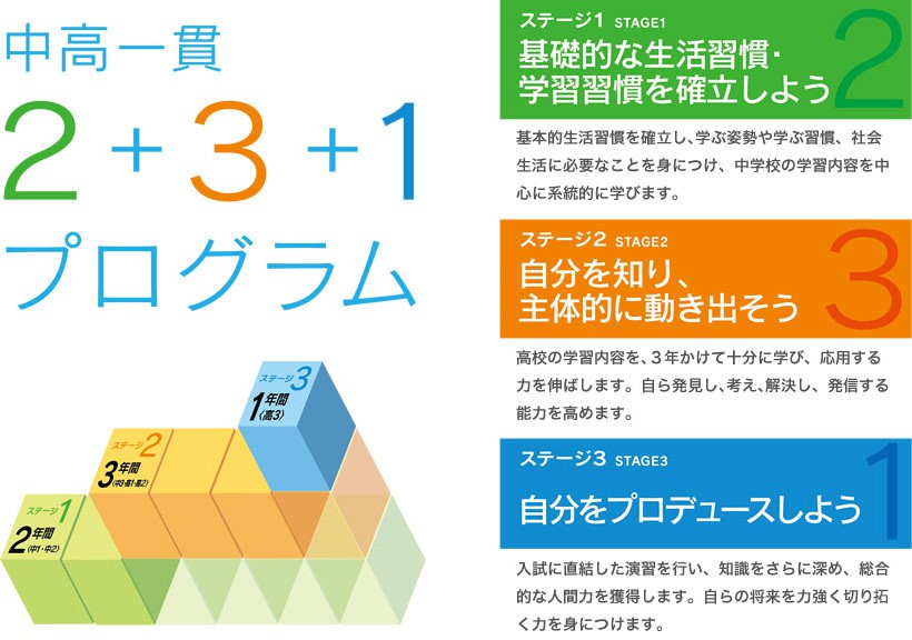 独自のカリキュラムで、6年間をかけて、基礎から応用まで学力を養成し、難関大学の現役合格をめざすプログラムです。
