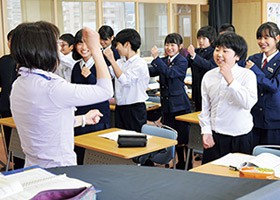 グローバル化が進む中、共通語としての英語は不可欠なコミュニケーションツールです。私たちが目指すのは、英語の授業を通して自国の文化・異文化の理解を深め、考えを共有し発信できる人材の育成です。4技能(読むこと、聞くこと、書くこと、話すこと)一体型の学習をすることでバランスのとれた英語力をじっくりと培います。授業の様々な活動を通して柔軟な考え方や適正な判断力を身につけ、グローバル社会でリーダーシップをとり、活躍できる人物の育成を目指します。