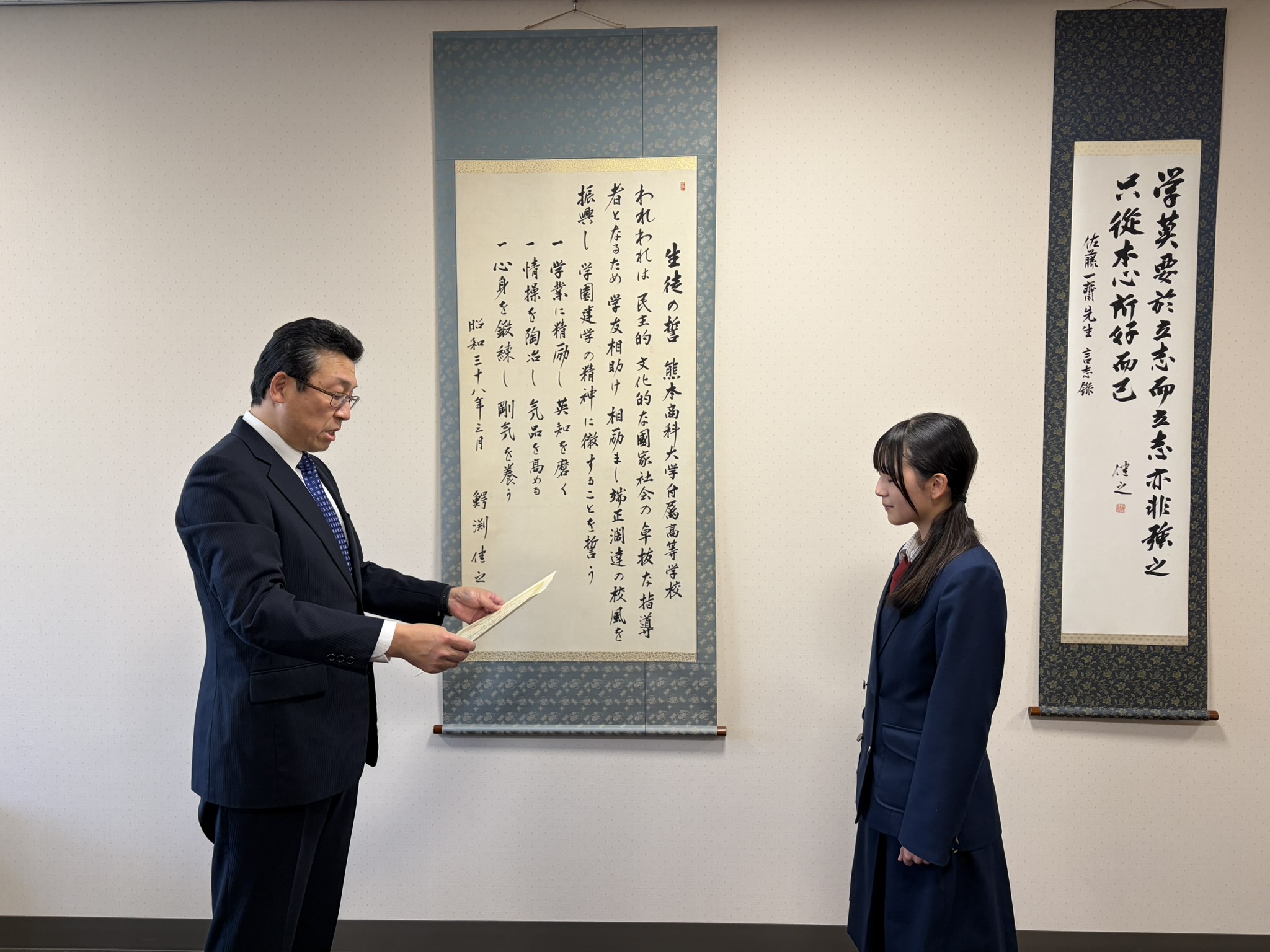 この度、令和7年度第64回税に関する高校生の作文コンクールにおいて、本校1年生の園田さんが「公益社団法人熊本法人会会長賞」を受賞し、11月27日に本校校長室において表彰式が執り行われました。